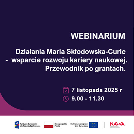 Serdecznie zapraszamy naukowców planujących rozwój kariery badawczej oraz tych, którzy pragną wzmacniać potencjał zespołów naukowych w ramach międzynarodowej współpracy szkoleniowo-badawczej, do udziału w webinarium: „Działania Maria Skłodowska-Curie – wsparcie rozwoju kariery naukowej. Przewodnik po grantach”.  Spotkanie online odbędzie się 7 listopada w godz. 9.00 – 11.30.