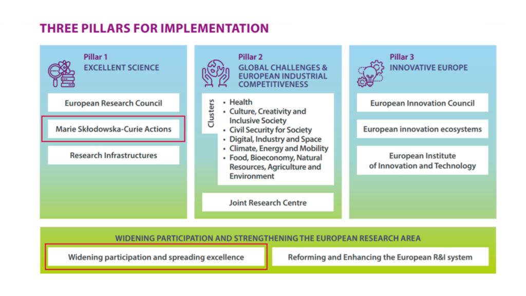 Ogromną zaletą programu Horyzont Europa jest sposób, w jaki jego poszczególne komponenty przenikają się wzajemnie. Dla przykładu „ślady” Marie Skłodowska-Curie Actions (MSCA), można odnaleźć nie tylko w Filarze I programu – Doskonała nauka, ale również w części przekrojowej Poszerzanie uczestnictwa i wzmacnianie Europejskiej Przestrzeni Badawczej (WIDERA). Powiązanie to, mimo że zapisane w programie, pozostaje relatywnie mało eksponowane, a oferuje dodatkowe możliwości finansowania projektów MSCA w krajach widening.